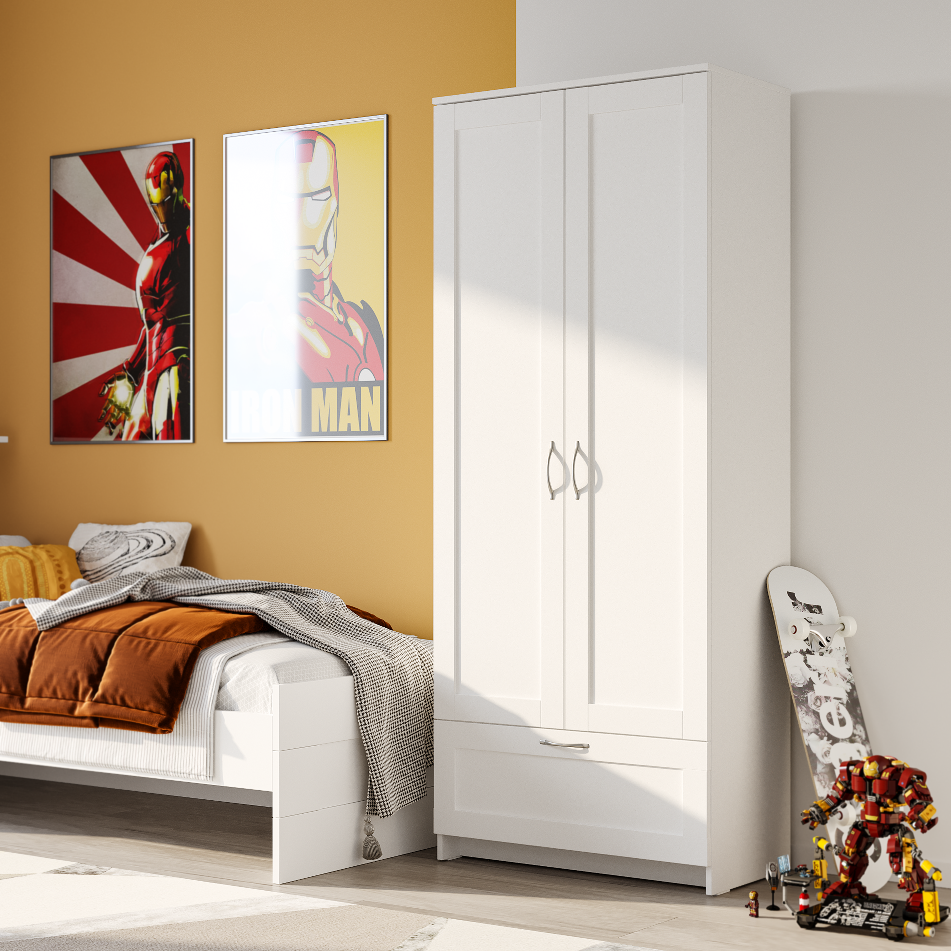 Шкаф оснащен вместительной штангой и полками, что делает его идеальным для хранения платьев и другой одежды. Распашные двери обеспечивают легкий доступ ко всем вещам, а отдельный ящик предоставляет дополнительное пространство для мелочей.