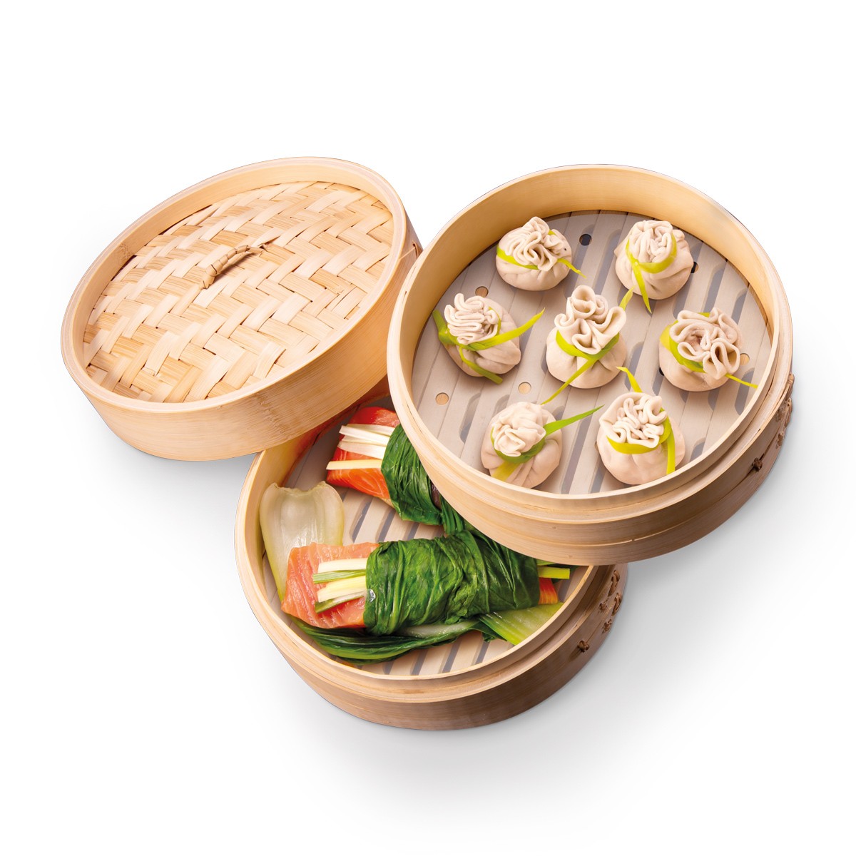 Конструкция из бамбуковых ёмкостей предназначена для приготовления пищи на пару. Резервуаром для воды в данном случае выступает кастрюля или сковорода WOK (в комплект не входит).