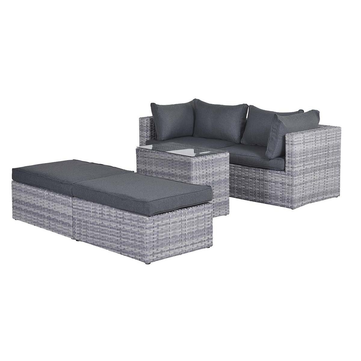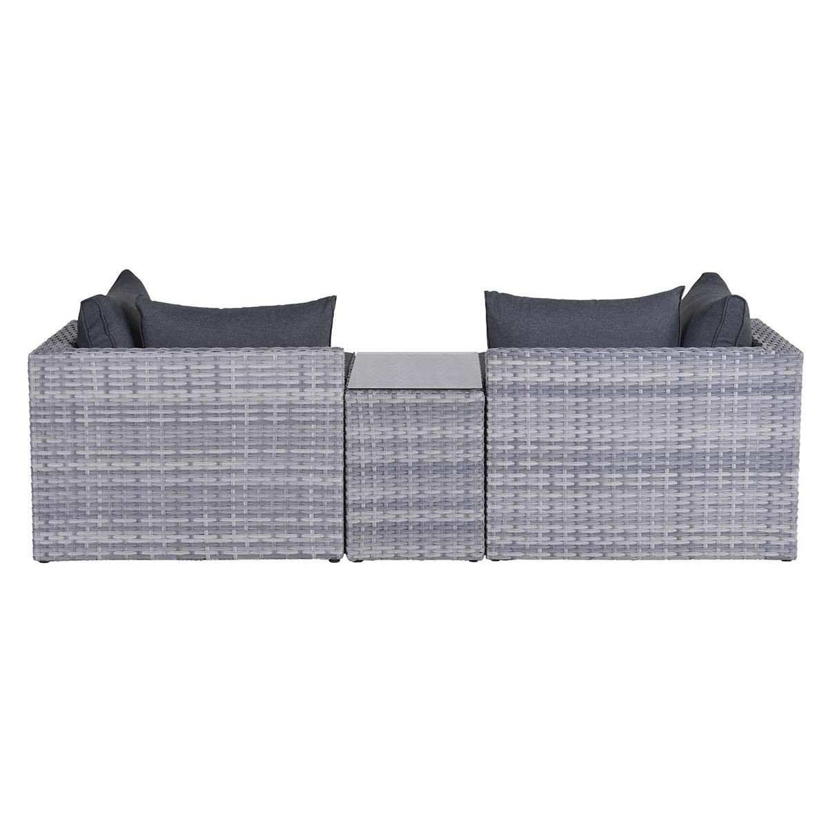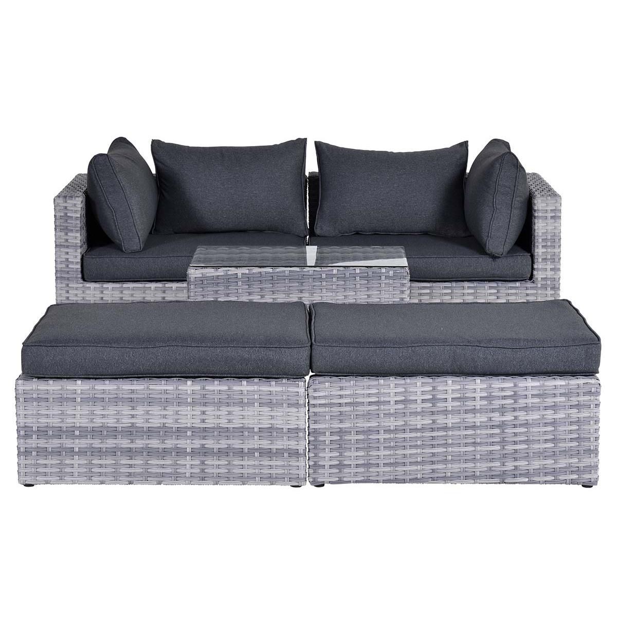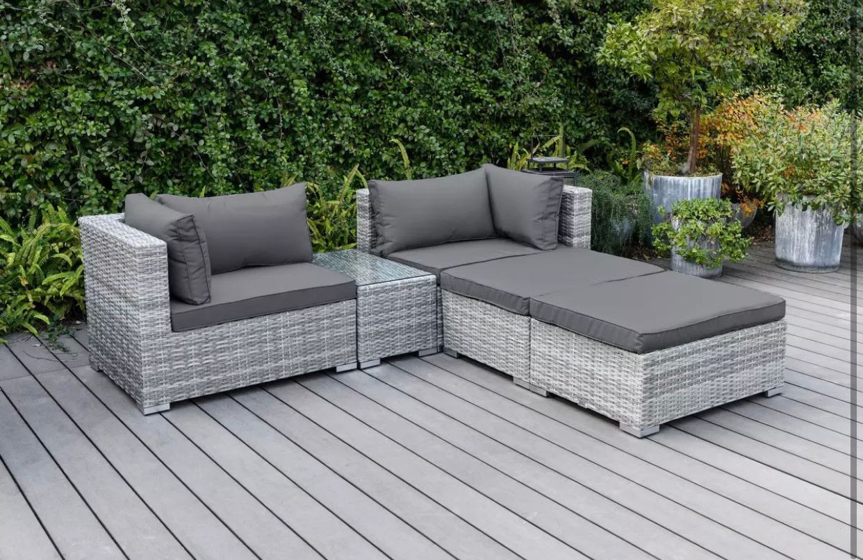 Искусственный ротанг и подушки из водоотталиквающей ткани — практичные и простые в уходе материалы.