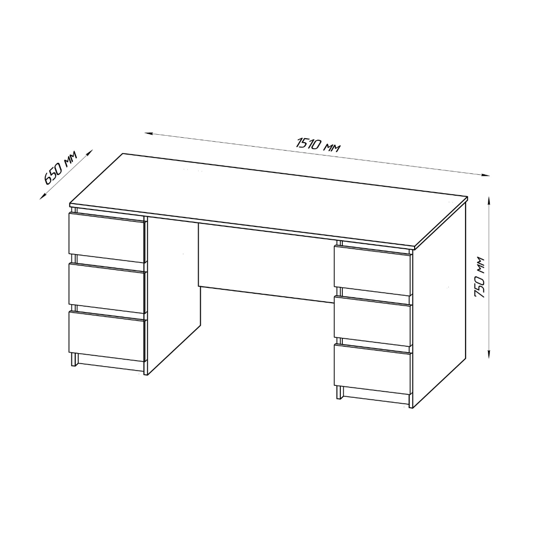 Письменный стол 151х65х75 см с 6 выдвижными ящиками без лицевой фурнитуры.